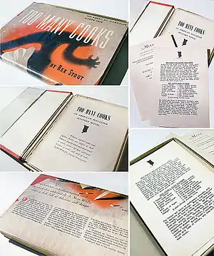 - In his limited-edition pamphlet, Collecting Mystery Fiction #9, Rex Stout's Nero Wolfe Part I, Otto Penzler describes the first edition of Too Many Cooks: "Red cloth, front cover and spine printed with black; rear cover blank. Issued in a full-color pictorial dust wrapper … The first edition has the publisher's monogram logo on the copyright page. The second printing, in October 1938, is identical to the first except that the logo was dropped."[14]