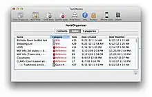 TopXNotes is a hybrid personal note and information organizer and password protector for Macintosh computers which allows notes to be entered and organized. It syncs notes to mobile devices — iPhone, iPad, and iPod touch.[1][2]