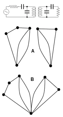 Many topology names relate to their appearance when drawn diagrammatically. Most circuits can be drawn in a variety of ways and consequently have a variety of names. For instance, the three circuits shown in Figure 1.1 all look different but have identical topologies.[2]