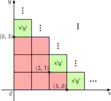 A monomial ideal can be interpreted as a Young diagram. Suppose , then can be interpreted in terms of the minimal monomials generators as , where and . The minimal monomial generators of can be seen as the inner corners of the Young diagram. The minimal generators would determine where we would draw the staircase diagram.[2] The monomials not in lie inside the staircase, and these monomials form a vector space basis for the quotient ring .
