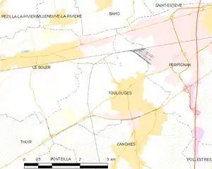 The town covers an area of 8.04 km2 (3.10 sq mi), with 669 inhabitants per km2. Toulouges borders the following municipalities: Perpignan, Canohès, Thuir, El Soler, and Baho.[4]
