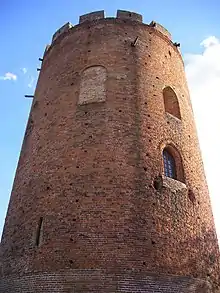 The Tower of Kamyenyets (Belarusian: Камянецкая вежа; Russian: Каменецкая башня), also called the White Tower (Belarusian: Белая вежа, romanized: Bielaya vieža), is the main landmark of the town of Kamyenyets in Belarus. The name Bielaja Vieža (alternative transliteration: Belaya Vezha), which literally means White Tower or White Fortress in Belarusian, presumably derives from the tower's proximity to the Belavezhskaya Pushcha Forest, but not from its color, which has been brick-red through the ages, never white.[1]