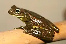The Rio golden-eyed tree frog (Trachycephalus imitatrix) is a species of frog in the family Hylidae found in Argentina and Brazil. Its natural habitats are subtropical or tropical moist lowland forests, subtropical or tropical moist montane forests, and freshwater marshes. It is threatened by habitat loss.