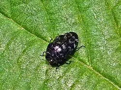 Trachys minutus is a beetle of the small size reaching a length of 3 to 3.5 millimeters. It is dark colored, shiny and slightly hairy. The female lays eggs on the leaves of deciduous trees, especially elm (Ulmus). The larvae eat the green tissue between the upper and lower layer of the leaves, making cavities called mines.