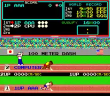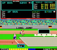 In each event, there is a qualifying time or level that the player must achieve to advance to the next event; failing to qualify (in one heat for running events or three tries in the other events) will reduce the player's number of lives by one, but if none are present in his/her disposal, the game will end.[8] Players earn extra lives per 100,000 points scored.