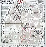 After further research I developed my own map; it eliminated eastern Colorado so that I could concentrate on western Colorado's mines and geography. I combined this map with probabilistic pass completion system [sic] and further research on the mines to arrive at Tracks to Telluride.