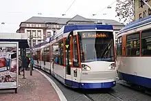 The Darmstadt tram network is a light rail system and the backbone of public transport within Darmstadt, a city in the federal state of Hesse, Germany. As of 2014, nine lines on four main routes (42 kilometres (26 mi)) serve 162 stops, including 92 low-floor stops.[1] The system is operated by HEAG mobilo, and is an integral part of the Rhein-Main-Verkehrsverbund (RMV), the public transit authority of the Rhein-Main-Area.