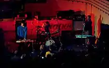 Nathan Means (bass, keyboards, vocoder, vocals), Philip Manley (lead guitar, bass, keyboards, vocals), and Sebastian Thomson (drums, bass, keyboards, guitar, vocals) formed Trans Am in 1990 near Washington, D.C.[1] The band started as a HarDCore project but their sound evolved as the members finished college to include additional influences, such as new wave, classic rock, and experimental rock.[2] In 1995, they began recording their music, which until 1998 was almost entirely instrumental. Their sound is generally marked with acoustic and electronic drums, guitars, electronics, and a varying amount of often-heavily processed vocals. Instrumental virtuosity (especially on drums) is a focal point. All of their albums have been released on the Chicago-based independent record label Thrill Jockey.