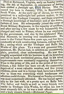 In 1836, a group of Richmond businessmen and industrialists led by Francis B. Deane, Jr. set about to capitalize on the growing railroad boom in the United States.[4] The group hired Rhys Davies, then a young engineer, to construct a new facility, brought a number of his fellow iron workers from Tredegar, Wales, to construct the furnaces and rolling mills. The foundry was named in honor of the town of Tredegar, where iron works of the same name were constructed in the early 19th century. The new works opened in 1837, yet the Panic of 1837 and accompanying downturn resulted in hardship for the new company.[4] Davies died in Richmond in September 1838 from stab wounds sustained in a fight with a workman and was buried on Belle Isle in the James River.