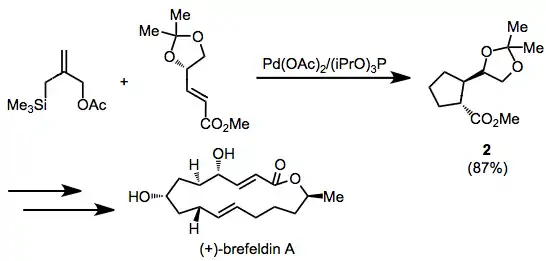 The high stereospecificity and stereoselectivity inherent in many TMM cycloaddition reactions is a significant advantage; for instance, the trans ring junction in TMM cycloaddition adduct 2 was carried through in a synthesis of (+)-brefeldin A.[17]