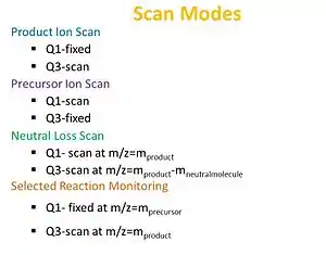The arrangement of the TQMS allows for four different scan types to be performed: a precursor ion scan, neutral loss scan, product ion scan, and selected reaction monitoring.[5]