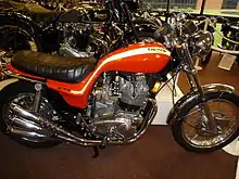The Triumph X-75 Hurricane was a 'factory special' motorcycle designed by fairing specialist Craig Vetter.[1] The X-75 had swooping glassfibre bodywork, a three US-gallon petrol tank, lowered gearing and a distinctive triple exhaust on the right-hand side. The motorcycle is credited with creating a new class of motorcycle, the cruiser.[2]