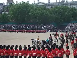 Trooping the Colour is a ceremonial event performed every year on Horse Guards Parade in London, United Kingdom, by regiments of Household Division, to celebrate the official birthday of the British sovereign.[1] It is also known as the Sovereign's Birthday Parade. Similar events are held in other countries of the Commonwealth. In the UK, it is, with the State Opening of Parliament, one of the biggest events of the ceremonial calendar, and watched by millions on TV and on the streets of London.