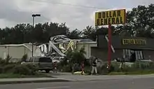 The tornado outbreak associated with the storm began with an F0 in St. Bernard Parish that destroyed a boat house.[23] A short-lived F1 tornado touched down in Reserve, striking a private high school, where it destroyed half of one classroom and damaged several others. Later, the F1 tornado passed through a trailer park and severely damaged or destroyed 20 trailers. One trailer with a woman and three children was lifted into the air and dropped 30 feet (9.1 m) away; four occupants were injured, none of them seriously. Damage from the tornado amounted to $2 million (2003 USD, $3.18 million 2024 USD).[24] A third tornado, rated an F0, struck Orleans Parish, damaging a car and a portion of a roof.[25]