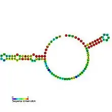 The Tryptophan operon leader is an RNA element found at the 5′ of some bacterial tryptophan operons. The leader sequence can form two different structures known as the terminator and the anti-terminator, based on the Tryptophan amounts in the cell. The leader also codes for very short peptide sequence that is rich in tryptophan. The terminator structure is recognised as a termination signal for RNA polymerase and the operon is not transcribed. This structure forms when the cell has an excess of tryptophan and ribosome movement over the leader transcript is not impeded.[1] When there is a deficiency of the charged tryptophanyl tRNA the ribosome translating the leader peptide stalls and the antiterminator structure can form. This allows RNA polymerase to transcribe the operon.