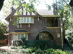 The principal wall material unlike many of Waterhouse's contemporary designs is a dark mahogany/brown brick combined with beautiful red/brown plane tiles and gables which are heavily half-timbered and pargetted with rough cast. Interestingly, Waterhouse was to choose a similar brick when he built his own house "The Gables" in Neutral Bay - between 1920 and 1923. The tall chimneys have their own gabled roofs and are almost a trademark of a Waterhouse design from this period. The large semi-circular arch which defined the front verandah of Tulkiyan echoes a favourite architectural motif of the great American architect, Henry Hobson Richardson.[1]