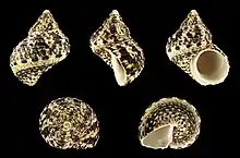Turbo bruneus, common name the brown (Pacific) dwarf turban or the little burnt turbo, is a species of sea snail, marine gastropod mollusk in the family Turbinidae.[1] These snails are called "turbo" because they can move quite quickly for a snail, using a muscular foot to glide along the ocean floor. They feed on algae and other small organisms that they scrape off rocks and other surfaces.
