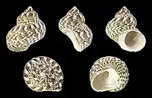 The operculum is rounded oval, with four whorls and a subcentral nucleus. Its outer surface is convex. The central portion is elevated, white, sharply granulate, and bounded by a wide groove which connects with a deep central pit by a lunate channel. Outside of this is a zone bearing about six narrow concentric beaded green lirulae, which are not continuous over the side of increment.[2]