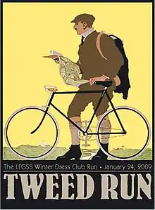 The Tweed Run is a group bicycle living history ride through the centre of London, in which the cyclists are expected to dress in retro style traditional British cycling attire, particularly tweed plus four suits. Any bicycle is acceptable on the Tweed Run, but classic vintage bicycles are encouraged. Some effort to recreate the spirit of a bygone era is always appreciated.[1] The ride dubs itself "A Metropolitan Cycle Ride With a Bit of Style."
