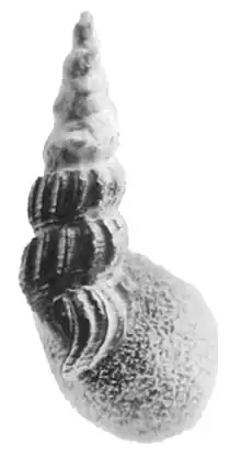 An apertural view of the shell of Tylomelania centaurus from its type description (holotype, NMB 1339a from Natural History Museum of Basel).[1] The shell is partly covered by the sponge Pachydictyum globosum.