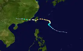 Early on September 19, Typhoon Fanapi made landfall over eastern Taiwan near Hualien City with winds of 162 km/h (101 mph), according to Taiwan's Central Weather Bureau.[11] The storm subsequently weakened over land,[3] dipping southwestward as convection diminished over the northern portion of the storm.[12] However, the storm resumed its westward trajectory and soon moved over the Taiwan Strait as a severe tropical storm.[3] The thunderstorms reorganized slightly as Fanapi reached open waters, and a nearby ship reported winds of 120 km/h (75 mph).[13] Early on September 20, the storm made a second landfall on southeastern China near Fujian and weakened further over land,[3][14] although thunderstorms persisted southeast of the circulation along the coast.[15] Fanapi weakened into a tropical depression later that day and dissipated late on September 21.[3]
