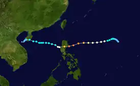 On September 26, the Japan Meteorological Agency (JMA) started to monitor a weak tropical depression that had developed about 1,260 km (785 mi) to the northwest of Manila in the Philippines.[1] During that day, while the depression moved towards the northwest its low level circulation centre rapidly consolidated in an area of favourable conditions for further development of the system. This prompted the Joint Typhoon Warning Center (JTWC) to issue a tropical cyclone formation alert on the system early the next day.[2] However less than 3 hours later, the JTWC decided to issue advisories on the system designating it as Tropical Depression 22W, before the JMA reported that the depression had become a tropical storm and named it Nalgae.[1][3][4]