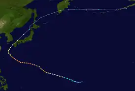 A break in the ridge steered Songda northward after the storm struck Okinawa. The storm gradually weakened, partly due to drier air, and accelerated northeastward on September 6 toward western Japan.[1] At 00:00 UTC on September 7, Songda made landfall on Nagasaki in western Kyushu with 10 minute winds of 140 km/h (85 mph).[2] Influenced by an approaching shortwave trough, the storm raced into the Sea of Japan and weakened to tropical storm status. Late on September 7, the JTWC issued their last advisory on Songda, noting that the storm was becoming extratropical.[3] The JMA declared Songda as fully extratropical at 00:00 UTC the next day while the storm was just west of Hokkaido;[2] at that time, the storm merged with a nearby non-tropical low and a cold front.[5] After a brief turn to the north, the storm moved northeastward over northern Hokkaido and southern Sakhalin and entered the Sea of Okhotsk. On September 9, the remnants of Songda moved across the southern Kamchatka Peninsula before moving into the Bering Sea. Late on September 10, the JMA stopped tracking the storm after Songda crossed the 180th meridian.[2][5] The storm continued eastward, entering the Gulf of Alaska on September 11. Two days later, the system moved inland after weakening further.[5]