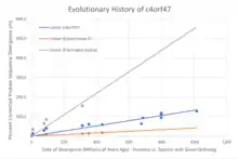 The c4orf47 gene has been evolving at a relatively slow rate when compared to the evolutionary rates of Fibrinogen Alpha and Cytochrome C. This suggests there is a conserved function for the encoded protein.