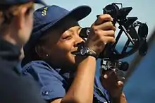 A Coast Guard officer candidate uses a sextant to shoot a sun line to determine Eagle's position in 2012