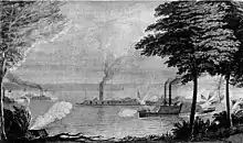 With the fall of Vicksburg in July 1863, General Bragg remained in the vicinity until her departure 13 December, for her new station at the mouth of the Red River. During the spring of 1864, it was her duty to guard the mouth of the river in support of the joint expedition against Shreveport, Louisiana on the Red. She began patrolling the river again, and 15 June engaged a Confederate battery with Naiad near Tunica Bend, Louisiana. Per the later captured battle flag of Barlow's Battery, now preserved at the Illinois National Guard Museum, thirty-two rounds were fired at the General Bragg. For a time the ships got the worst of the action amid a hail of shot and musketry, but eventually drove off the Confederates with the help of Winnebago. General Bragg was disabled in the action.