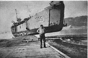 Following shakedown off Florida, LST-799 loaded construction equipment at Gulfport, Mississippi, and steamed on 29 November for the West Coast. Loading ammunition cargo at San Francisco, California, she departed on 13 February 1945, and arrived at Saipan on 24 March. Two days later she was en route to Okinawa, where the largest amphibious operation of the Pacific war was about to begin. Under the threat of enemy air raids, LST-799 approached the beaches of Okinawa on 2 April, one day after the initial landings. On 3 April LST-599 was hit by a kamikaze and a fire-rescue party from LST-799 assisted in extinguishing the blaze caused by the impact. The landing ship was on General Quarters consistently during the next month as the enemy made a futile effort to stop the accelerating American drive across the Pacific toward Japan. Departing Okinawa on 8 May, LST-799 sailed to Ulithi and for the rest of the war shuttled cargo among the American-held bases.