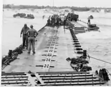 Unloading onto pontoons to cross a shallow beach.