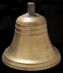 A cast brass bell from the U.S.S. Minnesota is engraved "MINNESOTA / U.S.W.N.Y. 1856" Image from the collection of the Minnesota Historical Society