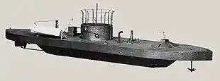 USS Monitor was an ironclad warship built for the United States Navy during the American Civil War and completed in early 1862, the first such ship commissioned by the Navy.[lower-alpha 1] Monitor played a central role in the Battle of Hampton Roads on 9 March under the command of Lieutenant John L. Worden, where she fought the casemate ironclad CSS Virginia (built on the hull of the scuttled steam frigate USS Merrimack) to a stalemate. The design of the ship was distinguished by its revolving turret, which was designed by American inventor Theodore Timby; it was quickly duplicated and established the monitor class and type of armored warship built for the American Navy over the next several decades.