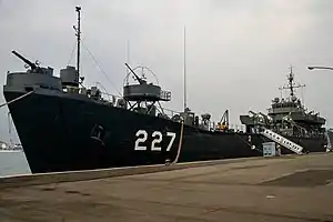 She was decommissioned on 1 July 1946 and struck from the Naval Register on 6 February 1956 after she was transferred to the Republic of China and renamed Chung Ming (LST-227).[2] While being mothballed on 1 July 1955, she was given the name Sweetwater County.