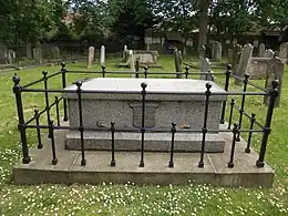 According to the History of the County of Middlesex, the scientist and businessman William Allen hired Foscolo to teach Italian at the Quaker school he co-founded, the Newington Academy for Girls.[20] His general bearing in society – as reported by Walter Scott – had not been such as to gain and retain lasting friendships. He died at Turnham Green on 10 September 1827, and was buried at St Nicholas Church, Chiswick, where his restored tomb remains to this day; it refers to him as the "wearied citizen poet", and incorrectly states his age as 50. Forty-four years after his death, on 7 June 1871, his remains were exhumed at the request of the King of Italy and taken to Florence, where with all the pride, pomp and circumstance of a great national mourning, found their final resting-place beside the monuments of Niccolò Machiavelli and Vittorio Alfieri, of Michelangelo and Galileo, in the church of Santa Croce,[8][21] the pantheon of Italian glory he had celebrated in Dei Sepolcri.