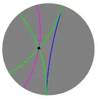 Poincaré disc model: The pink line is ultraparallel to the blue line and the green lines are limiting parallel to the blue line.
