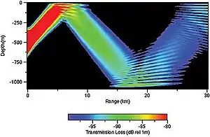 Output of a computer model of underwater acoustic propagation in a simplified ocean environment.