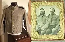 The use of wool in the uniform meant that the uniforms were not suited to the warm climates that were common in the South. This contributed to many Confederate soldiers suffering from heatstroke on long marches.[3] However, one understanding of the heavy woolen garments is that after the marching during the day time, when the soldiers would rest at night and cool themselves down, the thermal-shock could render some men unable to function the next day. As such, the woolen garments would protect the soldiers from this, and keep them able to keep marching the next day to fulfill their duties. This was also the case with the better equipped U.S. Army. Many Confederate soldiers started the war with frock coats. However, cloth shortages and wartime wear ensured that, by 1863, waist-length cadet gray or butternut shell jackets were generally worn by Confederates in the Eastern and Western Theaters. Examples of frock coats being worn by enlisted men can be seen in photographs taken after the battles of Gettysburg, (1863), and Spotsylvania, (1864).