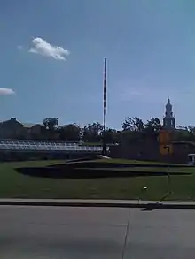 In 1979, an art selection committee was created, composed of NFTA commissioners and Buffalo area art experts, that would judge the artwork that would be displayed in and on the properties of eight stations on the Metro Rail line. Out of the 70 proposals submitted, 22 were chosen and are positioned inside and outside of the eight underground stations.[4] University station is home of three pieces of work, from Stephen Antonakos (New York City), Harvey Breverman (Buffalo), and Beverly Pepper (Todi, Italy and New York City). The work from Stephen Antonakos is called "Neon for South Campus Station" and is an "abstract form of neon tubing, creating large, incomplete circles and incomplete squares, mounted on the interior ceiling of the mezzanine level of the station." The 550 feet of tubing is red, orange and blue.[5] Harvey Breverman's work is "a large triptych on a semi-circular wall at the foot of the escalators at the trainroom level." The work is entitled Synoptic Triptych. It focuses on the composite nature of a diverse, evolving University (at Buffalo) community and it's attending resources.[5] Beverly Pepper's work is a sculpture of steel and grass located in the bus loop entitled Vertical Presence-Grass Dunes. The work changes in appearance as the passengers ride around the loop. An illusion of movement is created through the passing sun patterns.[5]