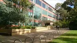 The Parkville campus is the primary campus of the university.[78] Originally established in a large area north of Grattan Street in Parkville, the campus has expanded well beyond its boundaries, with many of its newly acquired buildings located in the nearby suburb of Carlton.[79] The university is undertaking an "ambitious infrastructure program" to reshape campuses.[80] The campus was founded in 1853, and is located just north of Melbourne's central business district. There are a diverse range of cafés, two gyms, five university libraries, a bank branch, Australia Post parcel lockers, a bike shop, a boutique supermarket and a small pharmacy located on the Parkville campus. The campus is located within a broader knowledge precinct, which encompasses eight hospitals, and many other leading research institutes.[81]