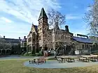 Several of the earliest campus buildings, such as the Old Quad and Baldwin Spencer buildings, feature period architecture in a Gothic revival style. The Old Quadrangle underwent extensive restoration in 2019 to return to elements of the original design, including a dedicated temporary exhibition space in the Treasury Gallery.[82] The new Wilson Hall replaced the original Gothic Revival building which was destroyed by fire.[83][84][85]