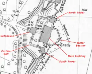 The castle's principal buildings are situated on the east side of a rectangular courtyard within which stand two large Turkey oaks, said to have been grown from acorns brought from Crimea after the Crimean War.[24] A stone curtain wall topped with brick surrounds the courtyard, standing about 1 m (3.3 ft) thick and 4 m (13 ft) high. The courtyard is entered on the north-western side through a four-storeyed gatehouse with gun embrasures for additional defensive strength.[20] It was substantially rebuilt in the 1650s after being badly damaged in a 1653 fire, traces of which can still be seen in the form of scorched stones on the first-floor walls.[24] A central gateway with a round arch leads into a passage that gives access to the courtyard. Above the gateway is a late 18th-century clock that was inserted into the existing structure. A wooden bellcote was added in the early 19th century, and a modern flagpole surmounts the building.[20]