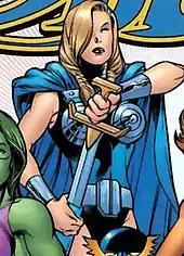 Valkyrie is a superheroine appearing in American comic books published by Marvel Comics. Created by Roy Thomas and John Buscema, the character first appeared in The Avengers #83 (December 1970).[1][2] She is based on the Norse mythological figure Brynhildr.[3] Valkyrie became a mainstay of the superhero team known as the Defenders and a close ally and one-time love interest of the god Thor.