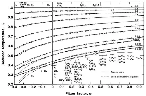 The first candidate for was the critical compressibility factor , but because that quantity is difficult to measure accurately, the acentric factor developed by Kenneth Pitzer, , is more useful. The saturation pressure in this situation is represented by a one parameter family of curves, . Several investigators have produced correlations of saturation data for a number of substances, the best is that of Dong and Lienhard,[57]