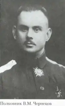 Vasily Mikhailovich Chernetsov (Russian: Василий Михайлович Чернецов; March 3, 1890 January 23, 1918) was a Don Cossack Russian Imperial Army officer who served as a colonel in the Don Army during the Russian Civil War. He led Chernetsov's Partisans, an independent irregular military unit commissioned by ataman Alexey Kaledin on November 7, 1917.