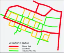 A diagrammatic depiction of the transportation network in Vauban. It shows the departure from the traditional simple grid and the adoption of a complex combination grid. The drawing shows the three types of connectors: roads in red, local streets in orange and pedestrian bicycle paths in green