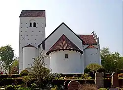 Veng Church (Veng Kirke) was constructed some time after 1100, probably as a replacement for an earlier wooden structure. It was built of limestone blocks, as were many early Danish monasteries, in the Romanesque style. It had a flat timber roof, a single nave, a choir, and an apse with two transepts, each with its own apse. The outside of the church retains several carved stones and other decorations from the original building. Even before the Danish Reformation there were no remains of Veng Abbey except for the church. Veng Church is now a parish church in the Diocese of Aarhus. [5] [6]