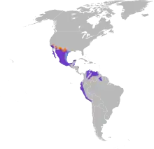 Their range includes almost all of Mexico, extending north into the southwestern United States, and south to scattered portions of Central America, and parts of northwestern and central South America. It has ranged as far north as Canada.[20] North American populations are generally resident, migrating only at the edge of the range. South American populations, especially those further south, may make long migrations to the northernmost parts of the Brazilian Amazon. This reflects a tendency to overwinter in areas where the temperature does not go below −1 °C (30 °F). Migrations may extend up to 4,000 km (2,500 mi). North American populations generally migrate by late August and return between February and April.[2] Their ability to migrate likely aided their wide colonization of the Americas.[8]