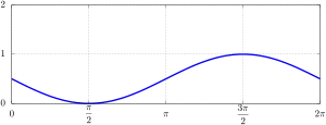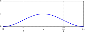 One period (0 < θ < 2π) of a versine or, more commonly, a haversine (or havercosine) waveform is also commonly used in signal processing and control theory as the shape of a pulse or a window function (including Hann, Hann–Poisson and Tukey windows), because it smoothly (continuous in value and slope) "turns on" from zero to one (for haversine) and back to zero.[nb 2] In these applications, it is named Hann function or raised-cosine filter. Likewise, the havercosine is used in raised-cosine distributions in probability theory and statistics.